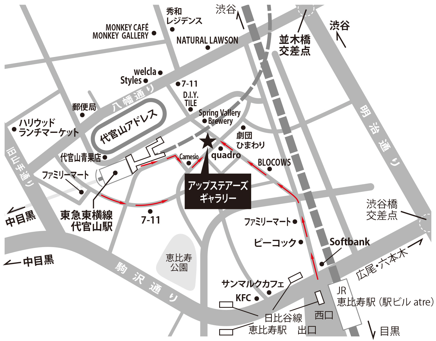 UPSTAIRS GALLERY 〒150-0021 東京都渋谷区恵比寿西2-18-6 SPビル2F ※当ビル1階は、「MR.FRIENDLY Cafe」 という、カフェになっています