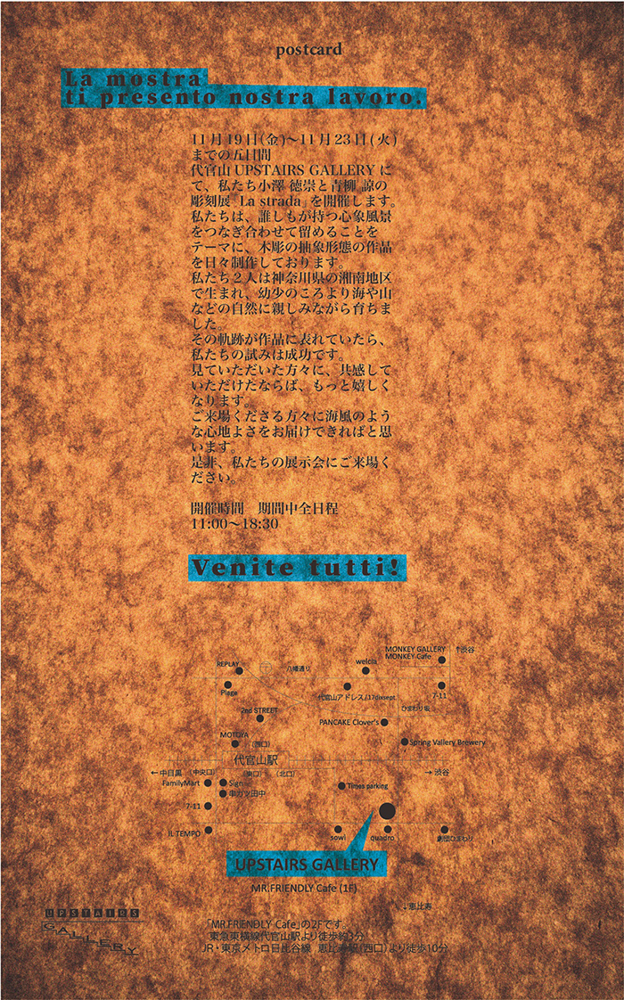 11月19日(金)〜11月23日(火)までの五日間、代官山UPSTAIRS GALLERYにて、私たち小澤 徳崇と青柳 諒の彫刻展「La strada」を開催します。